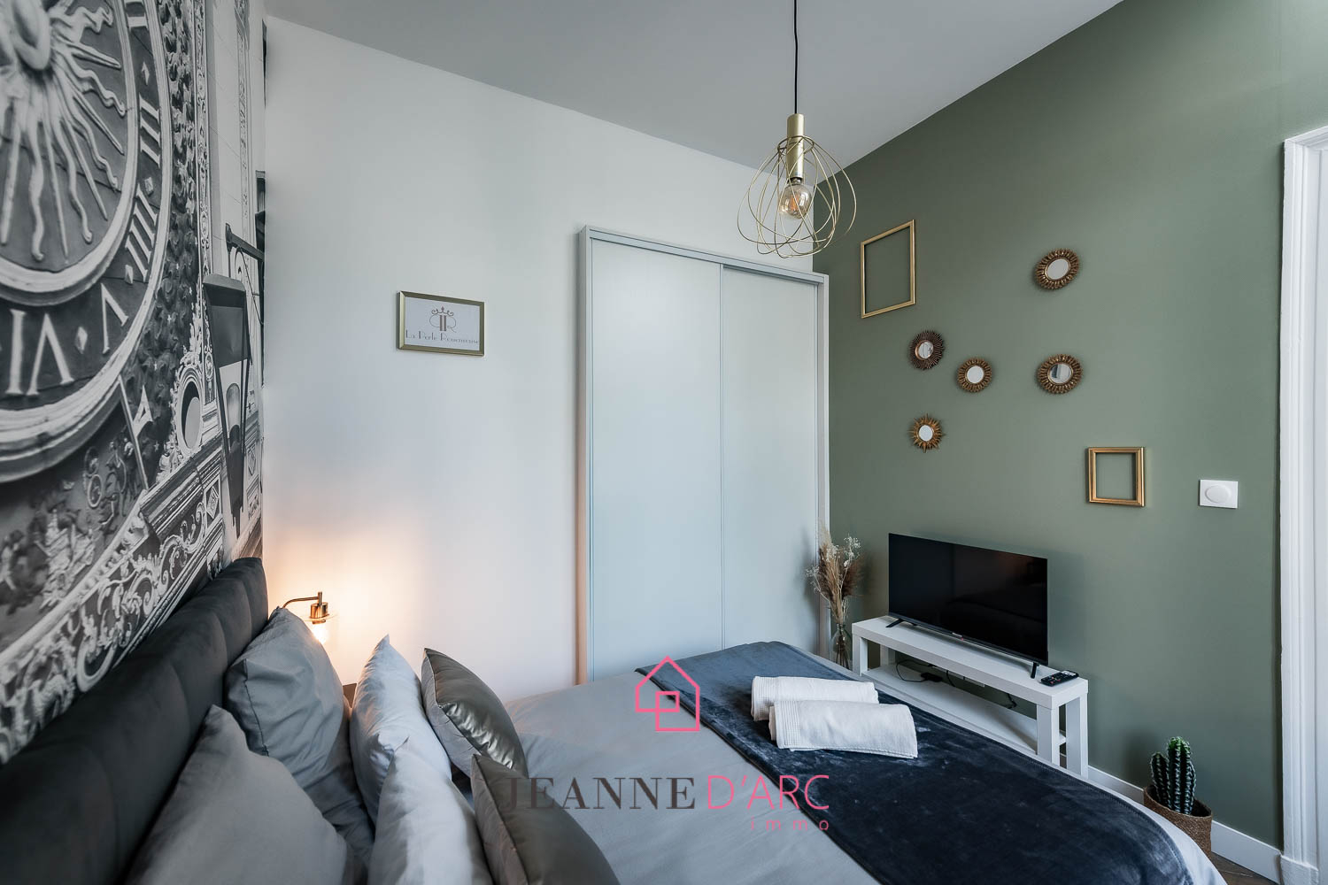 - Une chambre décorée avec goût et rangements intégrés,